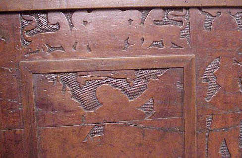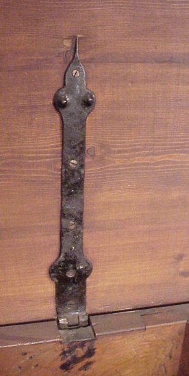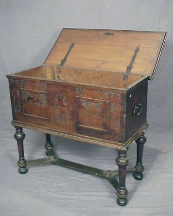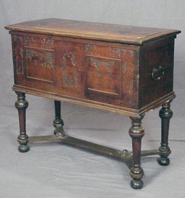 18TH C WALNUT CHEST ON STAND: William & Mary style base, scenic engraved top depicting Pilgrims. Hand wrought strap hinges. Est. $1500/2500**