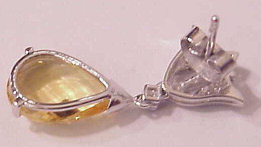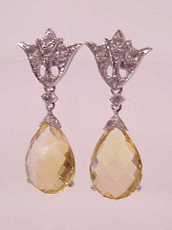 CITRINE EARRINGS: Briolette cut citrines of approx. 5.64ctw, set in 14k white gold filigree mounts accented with 20 full cut diamonds, approx. .14ctw, marked 585 and makers mark, approx. 1''l.