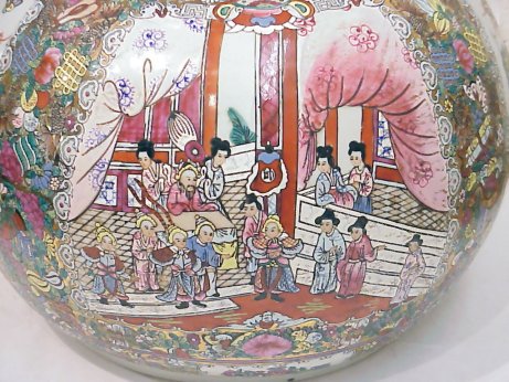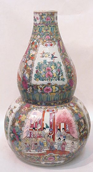 LARGE ROSE MANDARIN GOURD SHAPED VASE: Decorated in a court scene with figures. 26''h, 15'' dia. at the widest. Very heavy in weight.