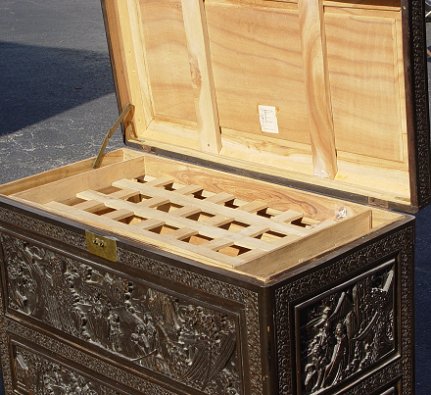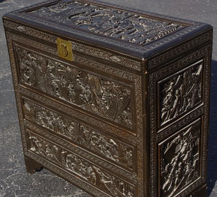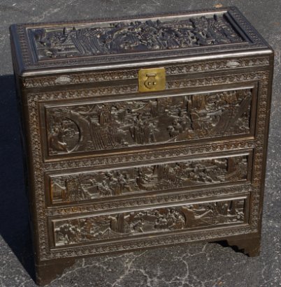 CARVED CHINESE DOWER CHEST: Hinged top with lift out tray in a camphor interior. Over 2 drawers. Entire surface is carved in scenic panels. 20th C. 36''h. 18'' x 36''.