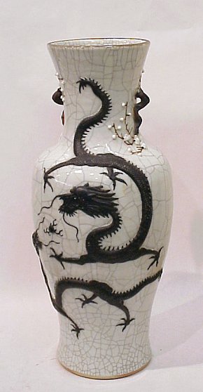 CHINESE SLIP DECORATED CELADON DRAGON VASE: Raised image of dragons on crackled glaze. 24 1/2''h. Age unknown.