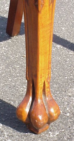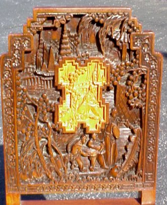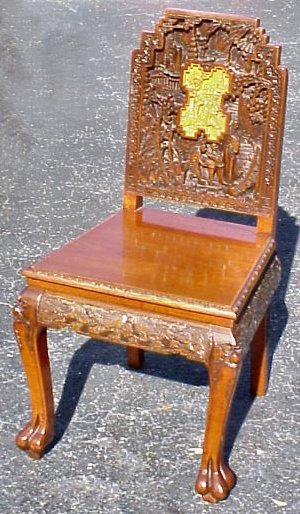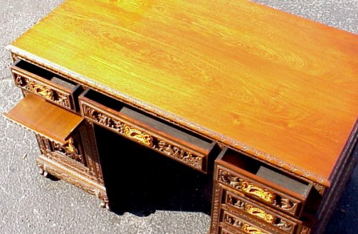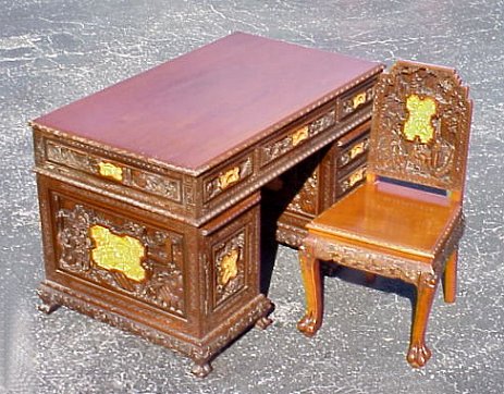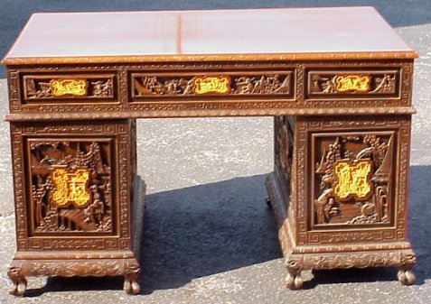 CHINESE CARVED KNEEHOLE DESK WITH CHAIR: Highly decorative and useful desk with 3 drawers across, pull out surfaces and matching chairs. The chair is carved to match the desk. Note the unusual faces carved on the legs of the chair. Later 20th C.