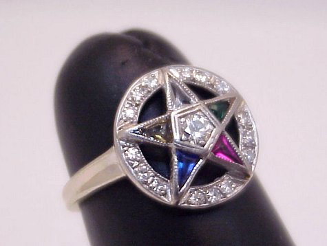 LADY'S EASTERN STAR RING: 14k white gold mount with 16 diamonds, approx. 1/4ctw, and star arms of emerald, ruby, blue sapphire, citrine and white sapphire?, size 4.