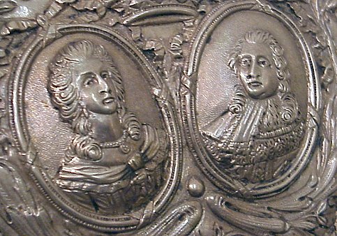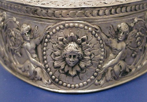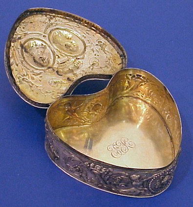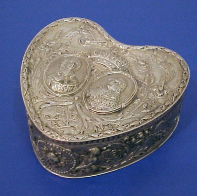 CONTINENTAL SILVER HEART SHAPED EMBOSSED BOX: Embossed Monarch portraits to lid, crowns and scrolling vines, frolicking Putti and child masks as well. Hallmarks seemingly indicated 18th Century Netherlands however we are unsure. 5''l x 1 3/4''h.