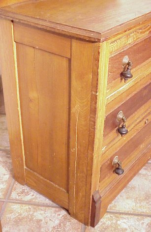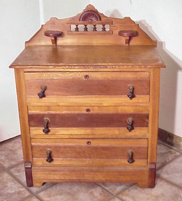 EASTLAKE VICTORIAN THREE DRAWER WASHSTAND: With candles shelves, shaped backsplash and drop ebony pulls. 36''h. overall, x 30'' x 29''.