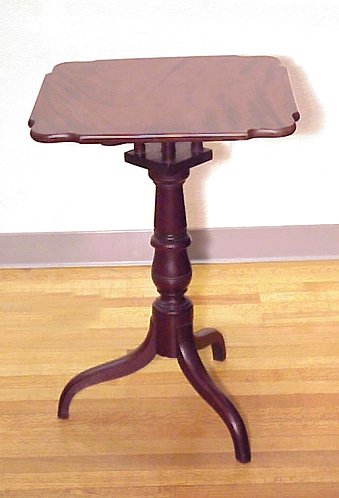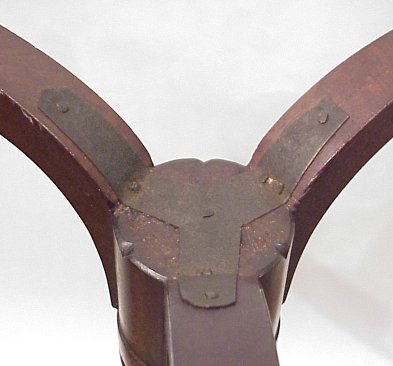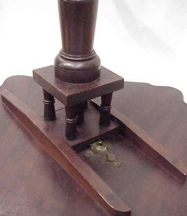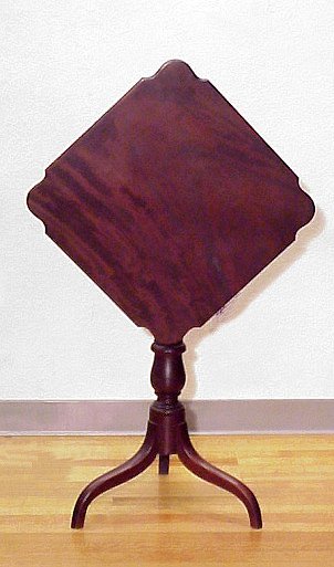 EARLY PERIOD MAHOGANY TILT TOP TEA TABLE: Finely grained and shaped solid mahogany top with birdcage. Turned pedestal base, spider legs.
