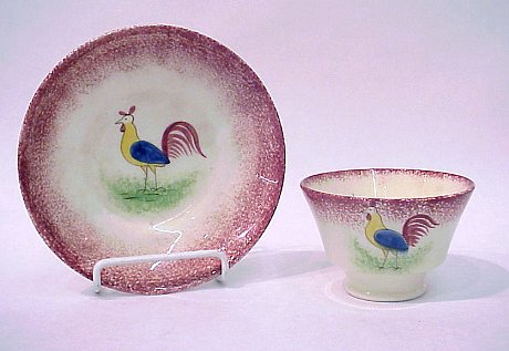 SPATTERWARE ROOSTER CUP AND SAUCER: Blue, yellow and red rooster on red. No chips or cracks, expect some crazing. Saucer is 5 3/4'' dia. Age Unknown.