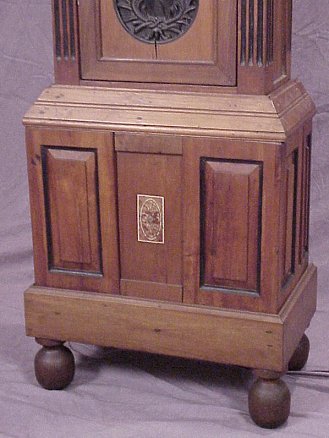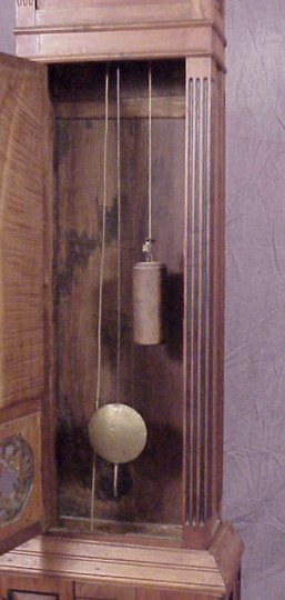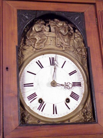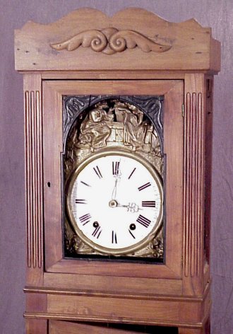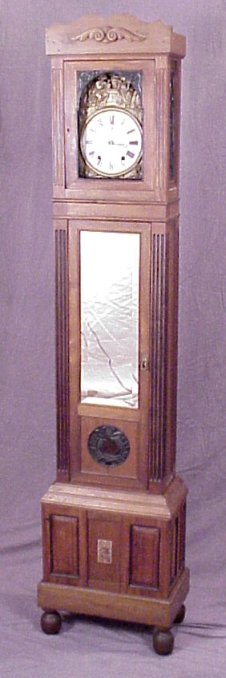 FRENCH MORBIER CLOCK IN TALL CASE: Key wind, weight driven clock in a later custom crafted case. The enamel dial has cracks. Case is 91''h, 21''w. with beveled mirror in the door, and fret work on one side.