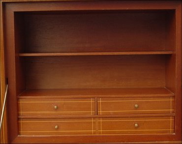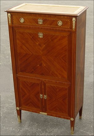 FRENCH SECRETAIRE ABATTANT: Quality 20 C rendition featuring tulip, satin, and kingwood inlays with ormolu to quarter columns and feet, 3 D inlay to quarter columns, string inlay to interior drawers. 57 1/2''h x 31 1/2''d x 17''d. Note: Missing marble top.