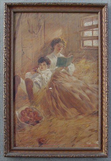 MORGAN, Issac (Ike), (American, 1871-1913): Illustration of woman reading to a child in a barn interior, O/C mounted on board, 22'' x 14'', signed lower right, encased in period frame 22 1/2'' x 16 1/2'', minor wear. Condition - Some paint loss in lower right corner and paint flake in lower left corner and left margin, several pin holes in upper right corner and scrape in center with paint loss, needs cleaning.