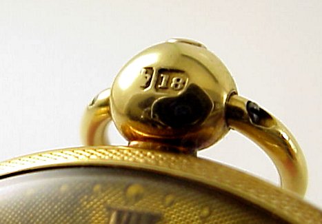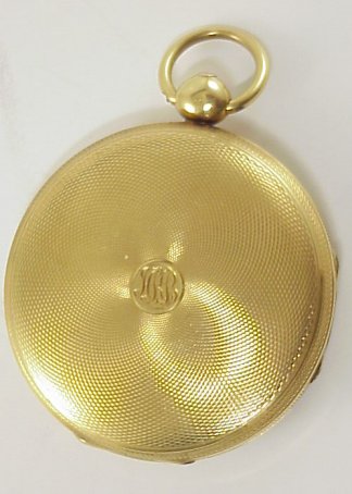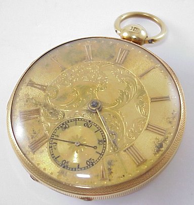 ENGLISH 18K GOLD KEY WIND POCKET WATCH: Adams & Son London, No 63138, case marked WF 1388, leopard head, 18 under crown and G?, wheel turned back centered by small monogram HKB, approx. 1 3/4''dia., key missing wings but still functional. Est. $500/700**