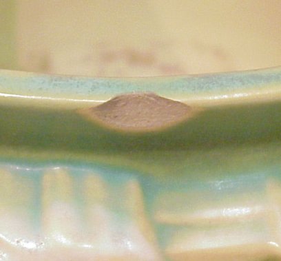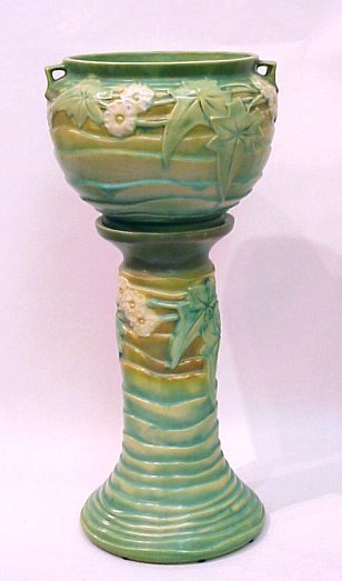 ROSEVILLE LUFFA JARDINIERE AND PEDESTAL: 11''dia. overall including handles. 24''h. Please note chip on jar, and roughness along edge of pedestal. Est. $350/550**