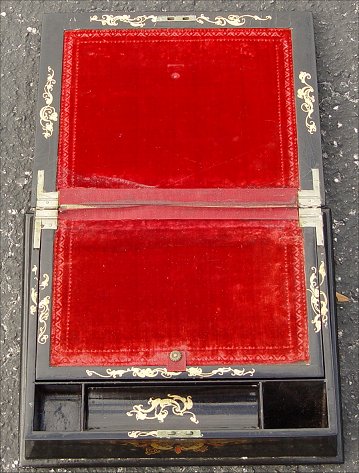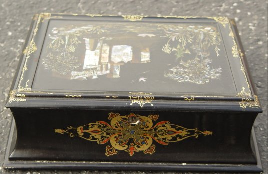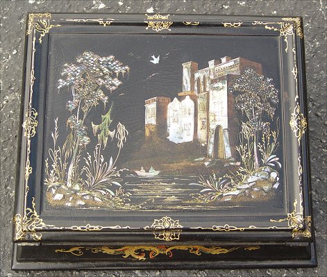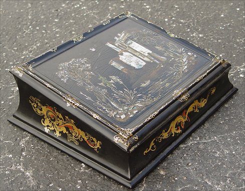 19TH C BLACK LACQUER LAP DESK: Beautiful box with mother of pearl inlaid scenic lid, depicting a castle by a lake with figures in a row boat, wooded shoreline and bird flying above, gold gilt scrolling trim with red, blue and green accents to edges and box sides. Gold gilt continues inside around the red velvet writing surface trimmed in scalloped cut work. 11 3/4'' x 9 5/8'', 3 1/2'' sloping to 2 1/2'', overall good condition with generalized craquelure to black.