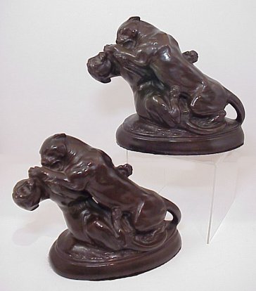 FIGHTING LEOPARD FIGURAL BOOKENDS: Bronzed metal, 7''h, 7''w.