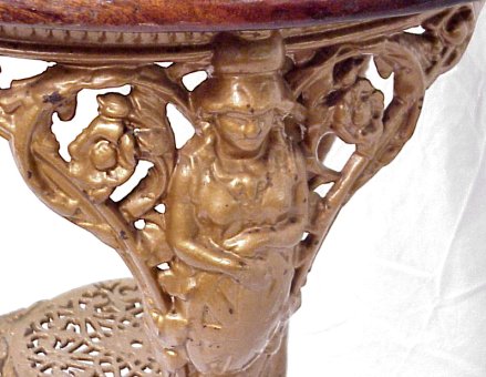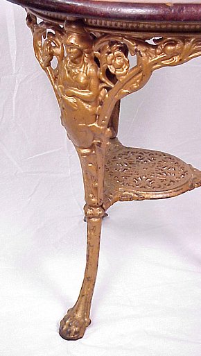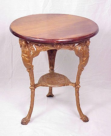 1880'S PUB TABLE: Cast iron base depicting pig-tailed maidens. 29 1/2''h x 26''dia. Est. $350/500**