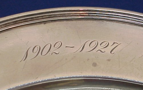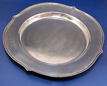DOMINIC & HAFF STERLING SALVER: Engraved 1902-1937, and monogrammed. Approx. 29.45 oz. 14'' dia. Surface scratches.