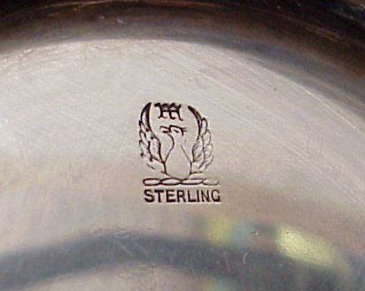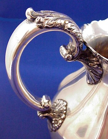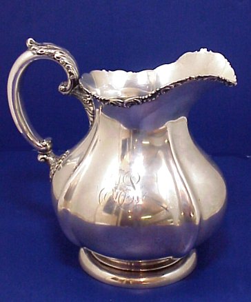 MERIDEN STERLING WATER PITCHER: 3 3/4 pint pitcher with ornate rim and handle. Monogrammed, ribbed sides, Approx. 18.9 oz. 8'' h. No dents, very minor scratches.