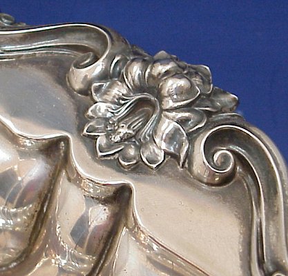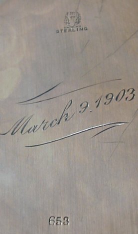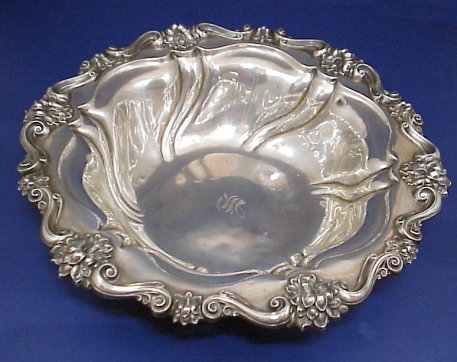 MERIDEN STERLING BOWL CA. 1902: Hollow rimmed floral border, monogrammed, swirls to the interior. Approx. 13.4 oz. 11'' dia. 2 1/2''h. Dated in script on the underside March 9, 1903