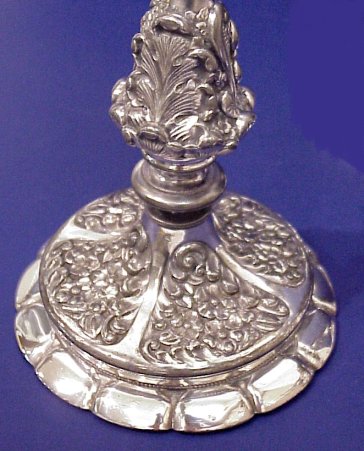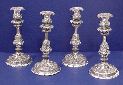 SET OF FOUR ORNATE WILCOX CANDLESTICKS: Floral embossed silver plate at it's best! Highly ornate acanthus leaf decorated stems raised on floral embossed round bases. Signed Wilcox Silverplate Co.. 10 3/4''h