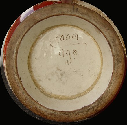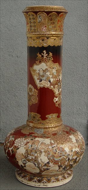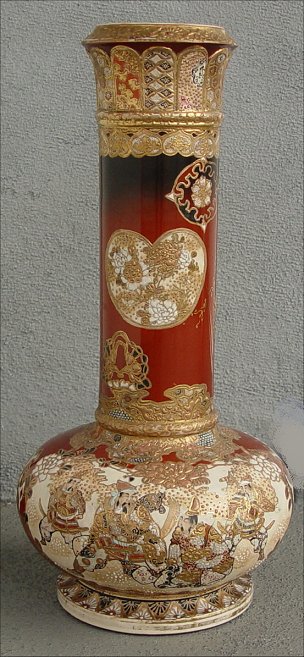 ORIENTAL SATSUMA STONEWARE VASE: Early 20th C. Raised moriage type bead decor. Scenes feature bearded warriors amongst gilt enambled floral design. Elongated cylindrical neck decorated with children at play. Base signed RAAOR? AGS, 21''h x 11''d.
