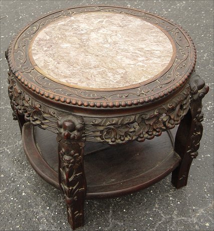 CARVED ORIENTAL LOW TABLE: With inset marble top. 19th century. 16''h x 19''dia.
