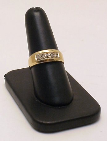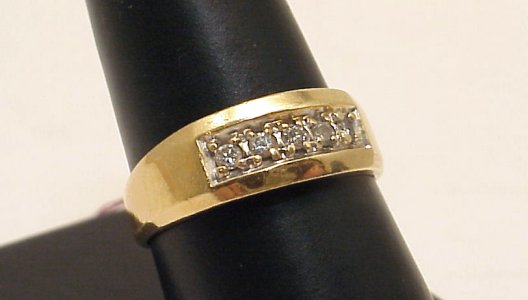 GENTLEMAN'S FIVE STONE DIAMOND RING: 14k yellow gold band with 5 diamonds prong set level with top of ring, approx. 1/4ctw, marked 14k Magic-Glo, size 9 1/2, 6 grams.