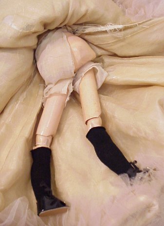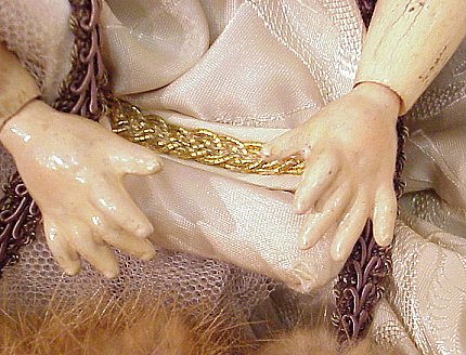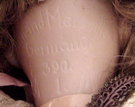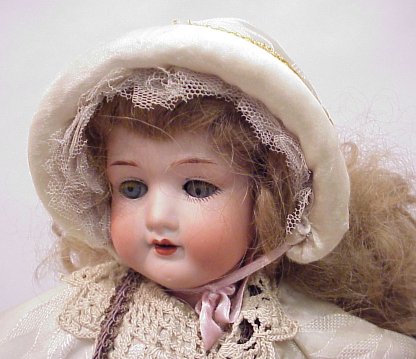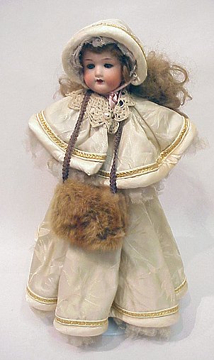 GERMAN BISQUE ARMAND MARSEILLE 390 DOLL: Bisque head doll with blue sleepy eyes with lashes, open mouth showing teeth, dimpled chin, long blonde wig, and rosy complexion. Fully jointed wooden body. Dressed in wintry dress, cape, bonnet and fur muff. Back of head impressed ''Armand Marseille/ Germany 390/ A 1 M''. Approx 18''h. No cracks in head, all fingers in place.