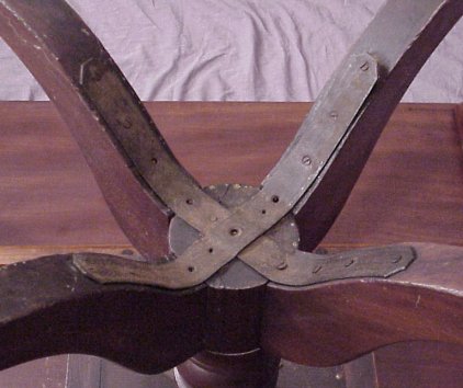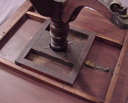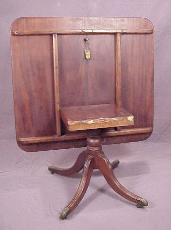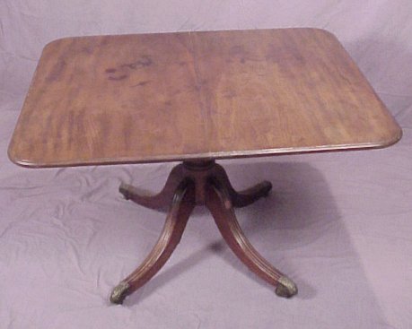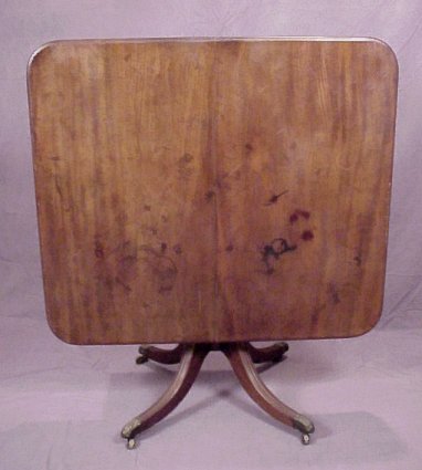 EARLY TILT TOP TABLE: Large square top, 42'' x 46 1/2'', on turned pedestal base ending in four splay legs with decorative end caps on castors, 27 1/2''h.
