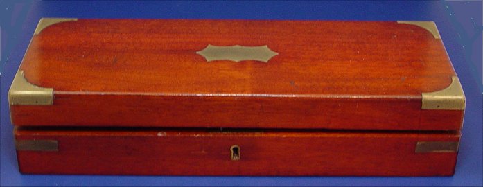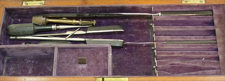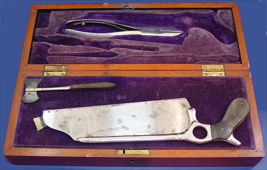 CIVIL WAR SURGEONS KIT: Shepard & Dudly Makers. Bone saw and all encased in a brass capes walnut box. 15 1/2'' x 6''