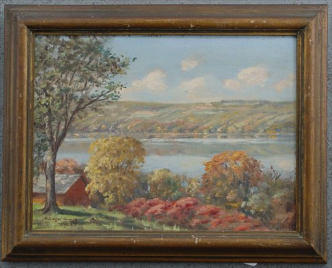GEORGE, S. Edgar, (American, 20th C): ''Owasco Lake near Ensenore'', O/CB, 11 3/4'' x 16'', signed lower left, dated 1943, label with title affixed verso.