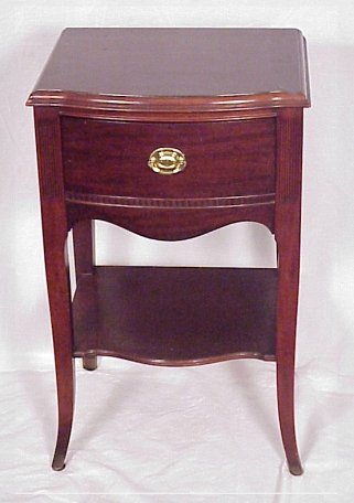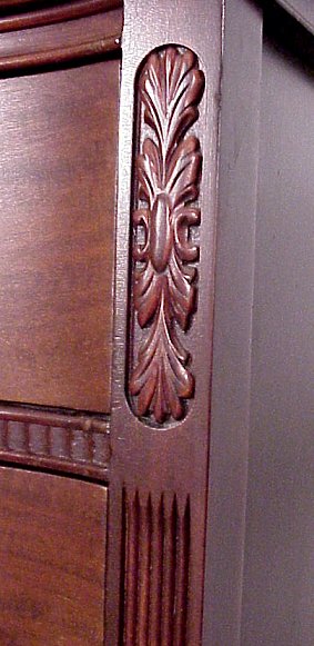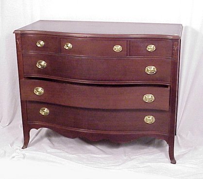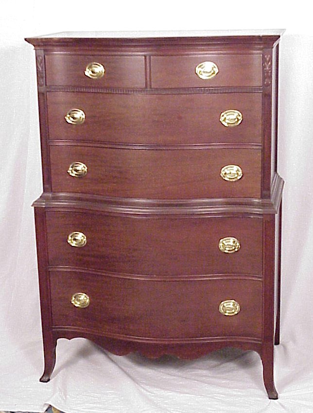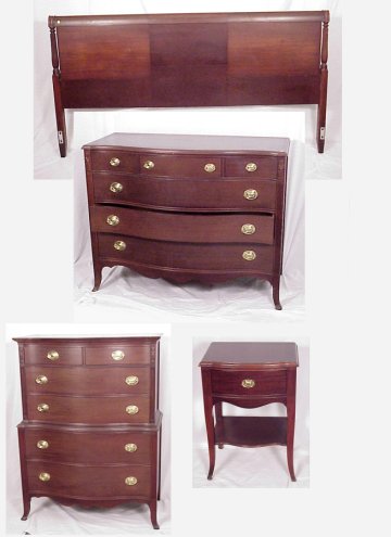 MAHOGANY BEDROOM SUITE: 4 piece to include serpentine front TALL CHEST, 52 1/2''h, 36''w. DRESSER, 37''h. x 46''w., NIGHTSTAND, and KING size headboard converted from twin headboards.