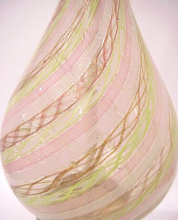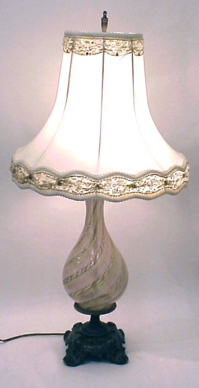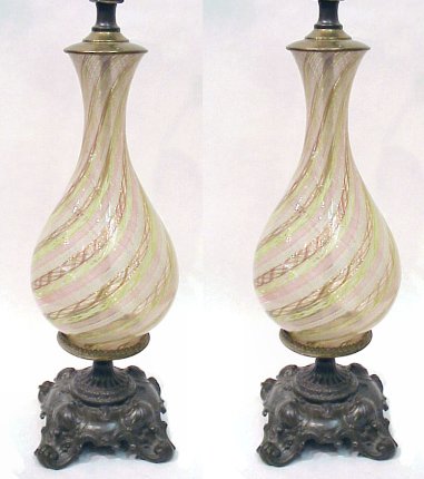 PAIR OF VENETIAN LATTICINO GLASS LAMPS: Twisted canes of pink, green and white with gold flecks. Mounted on ornate patinated metal bases. Glass is 9 1/4''h. Lamps are 29''h. overall. Includes shades and finials.