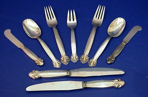 GEORG JENSEN ''BITTERSWEET'' STERLING FLATWARE: 9 pieces to include 2 dinner knives (8 7/8''), 2 dinner forks, 1 salad fork, 2 spoons, and 2 butter spreaders, one with a damaged blade.