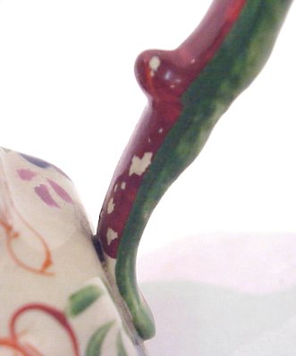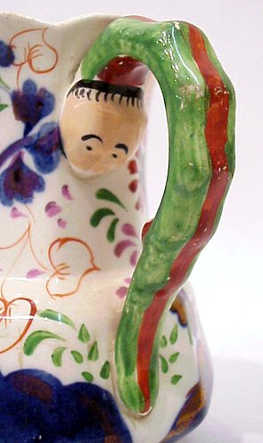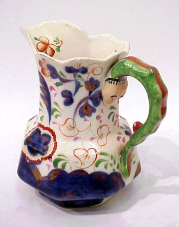 GAUDY WELSH SNAKE HANDLE JUG: In the ''Sunflower'' pattern by Allerton. 5 1/2''h. Please note loss of paint flecks to interior of handle.