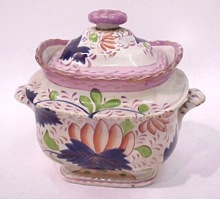 GAUDY WELSH ''GRAPE'' COVERED SUGAR: 6 1/2''h, 7''w. Please note repair to base and finial.