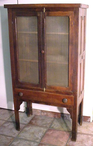 SHARECROPPERS PIE SAFE: 2 door screen front pie safe complete folds up to move on to the next crop. Oak and mixed wood. 5'h, 17 1/2'' x 32''.