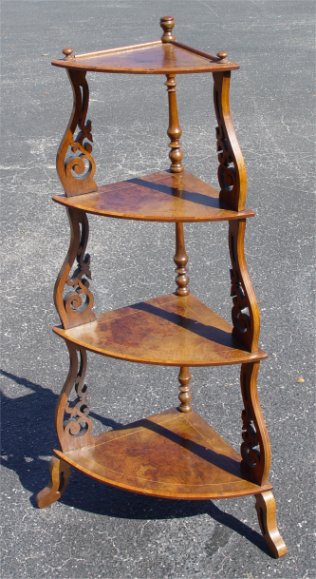VICTORIAN BURL WALNUT 4 SHELF ETAGERE': Beautifully grained with satinwood string inlay, pierced floral carved supports. 45''h x 26''w.
