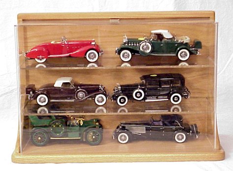 COLLECTION OF 6 DIE CAST CARS IN CUSTOM DISPLAY: 1:16 scale cars to include, 1905 Rolls Royce, 1940 Duesenberg, 1934 Packard, 1930 Cadillac, 1933 Cadillac and 1935 Duesenberg, die cast recreations in hand made wood and lucite display.