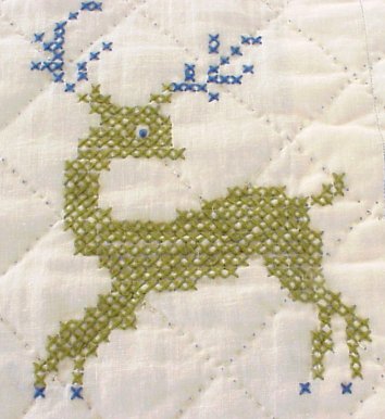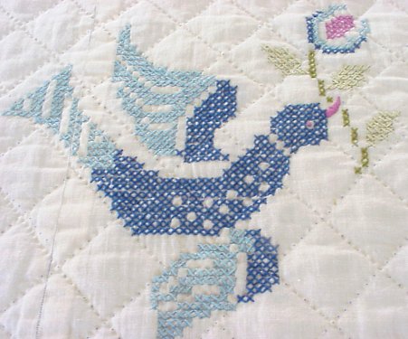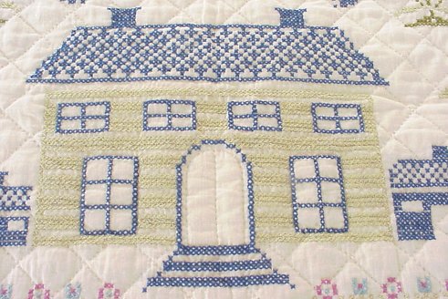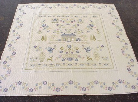 HAND SEWN CROSS STITCH QUILT: Blue and green with a bit of fuchsia on white ground. House, birds and trees motif. No tears or stains. 8' x 7'11''.