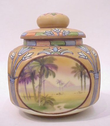 NIPPON EGYPTIAN PALM TREE AND PYRAMID HUMIDOR: Hand painted palm and dessert design. Squat shaped with panel sides. Heavy moriage type enameling. Bears the mark of Morimura Bros. 6 1/2''h. 5'' dia. No chips, cracks or repairs.