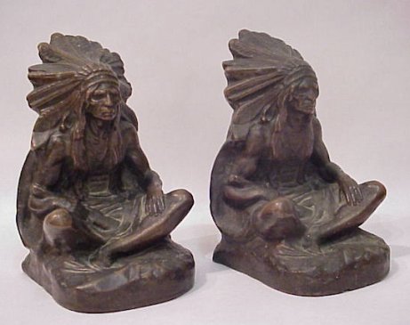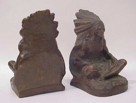 KATHODIAN ARTBRONZ NATIVE AMERICAN FIGURAL BOOKENDS: Pre 1930's copper clad heavy bookends in the form of a Native American in headdress. Kathodian Bronze Works used the trademark name Artbronz. 7 7/8''h.