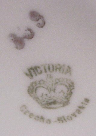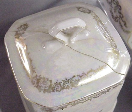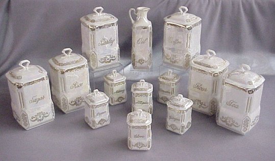 VICTORIA CZECHO-SLOVAKIA 12 PC CANISTER SET: 6 each - large and small, one large lid cracked. Sold with partially repaired oil cruet.