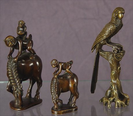 MINIATURE BRONZE, 3 PIECE GROUPING: Includes a Macaw sitting on his perch, 7 1/2''h, 2 monkeys sitting on a horse's back, probably Japanese, 6 1/2''h. and one monkey sitting on a horse's back 4''h. 3 items sold as a lot.