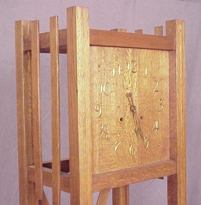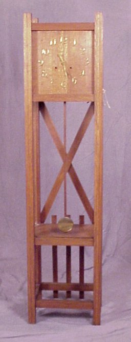 PERIOD MISSION OAK GRANDFATHER CLOCK: Sectioned oak pillars, brass numerals to face. 71''h x 17''.