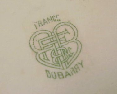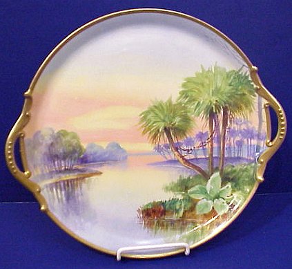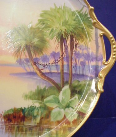 DUBARRY FRENCH LIMOGES TRAY: Hand painted in a tropical palm tree landscape. Pierced handle, gilt rimmed tray. 10'' dia.