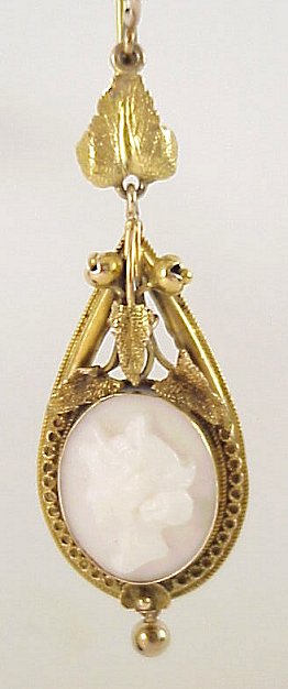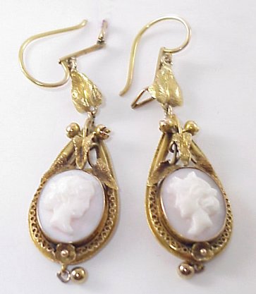 VICTORIAN CAMEO DANGLE EARRINGS: 14k yellow gold dangle earrings with wire work, flower and foliate decoration, centered by soft shell cameos in opposed positions, approx. 2 1/4''l. Est. $600/800**