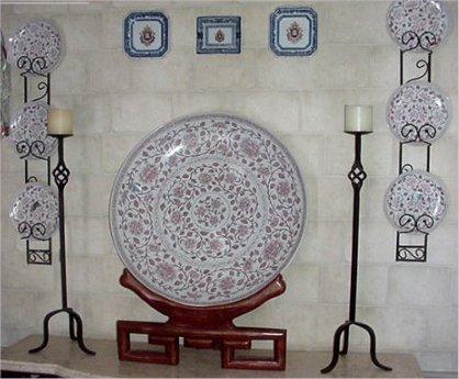 MASSIVE EARTHENWARE CHARGER: Group dining at its best. Main dish being a 31'' dia. low bowl accompanied by 10 dinner plates, six 9'' bowls, and four 8'' bowls. Included are the wooden stand and iron wall racks.
