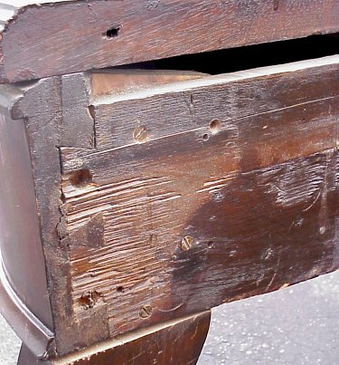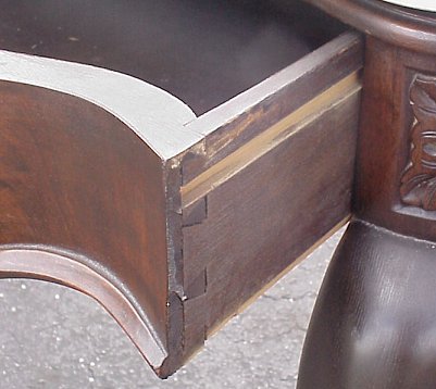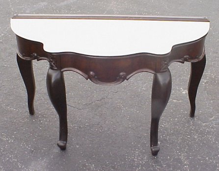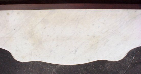 MID 19TH C MARBLE TOP TABLE: Serpentine front, one drawer foyer table of beveled white marble over base of carved mahogany. Featuring very substantial cabriole legs. 30''h, 47 1/2''w, 18 1/2'' deep.