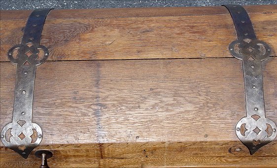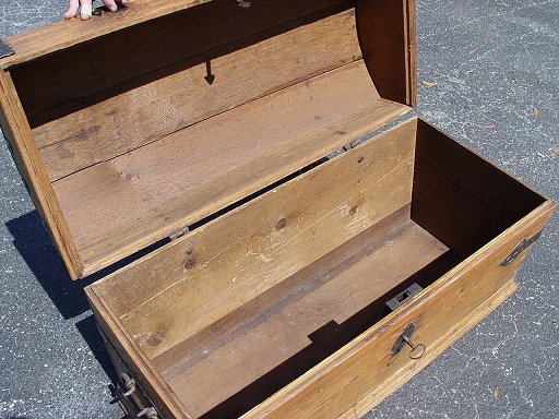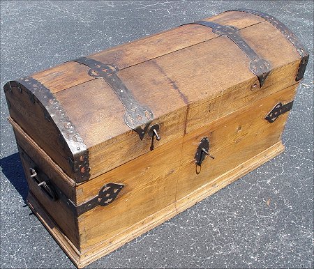 EARLY DOMED TRUNK WITH IRON STRAPWORK: Probably 19th, possible late 18th C., 24 1/4''h x 20''d x 44''w, possible replaced bottom, protruding nails.