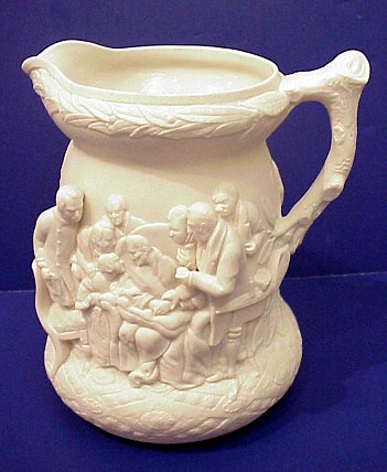 19th C WHITE ENGLISH SALT GLAZE EARTHENWARE JUG: Deep dimensional figures. 9 1/2''h.